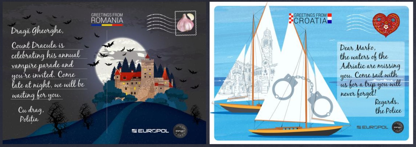 A Europol está a fazer uma campanha de Verão muito original. Produziu uma série de 21 postais dirigidos aos fugitivos mais procurados da Europa. Num comunicado citado pelo jornal Público, o Serviço Europeu de Polícia justificou a iniciativa explicando que os "destinos de férias são um esconderijo popular para criminosos a monte". Por isso, "quanto mais vistos forem os postais, melhores são as hipóteses de a polícia localizar estes criminosos e colocá-los atrás das grades".